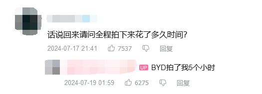 有人在评论区问UP全程拍下来花了多长时间,UP回复“BYD拍了我5个小时”,而整个视频仅有2分钟,不得不说排精致系列还挺需要技术的,瑞思拜。