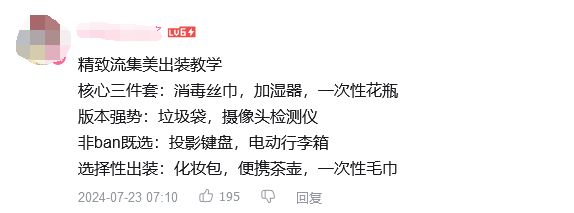 此时视频可能仅仅过了1分钟,相信大多数人看到这里就已经开始累了,要是每次出门让我带这些东西不如让我去死。随后的内容就回根据每个版本不同出强势装备,临时有事掏出激光键盘来敲几个字,渴了用自己带的茶具品一杯香茗,累了掏出充气U型枕美美的睡一觉,怕错过时间来个精致小闹钟,上厕所拿出摄像头检测仪看看有没有郭楠偷窥。