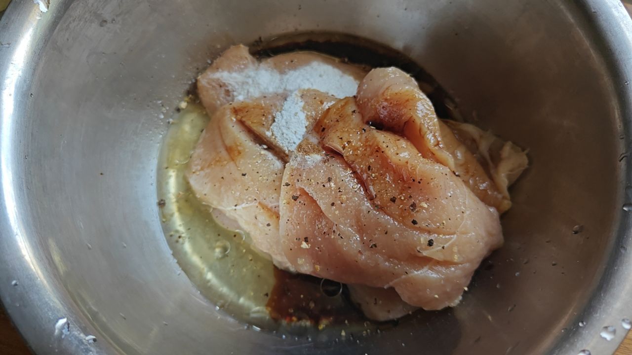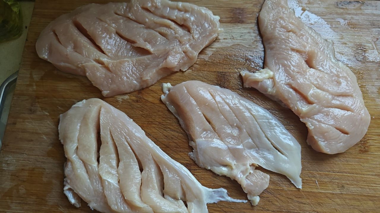 鸡胸处理:新鲜鸡胸肉,用水清洗干净,然后沿着中间部分切开,一定要改花刀,调料更容易吸收且更容易煎熟。