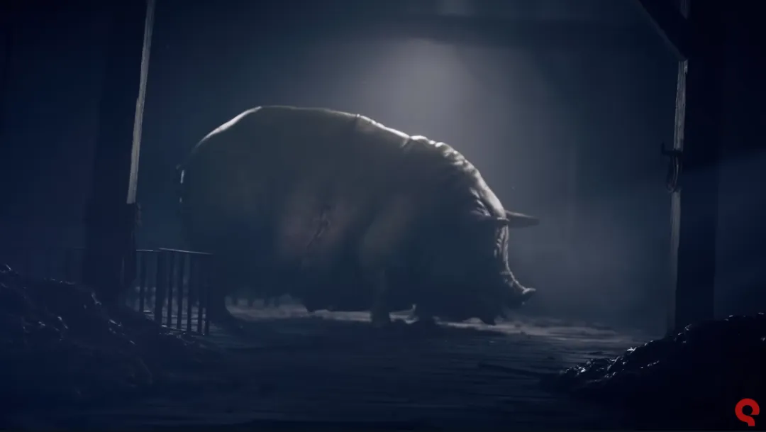 預熱短片中一隻腹部被縫合,但隨着走動傷口裂開的豬從畫面中走過。