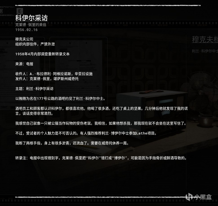 穆剋夫的監視員工以賄賂的名義接觸了科伊爾中士,從員工的彙報中我們可以看出科伊爾中士的個人魅力,僅僅是短暫的接觸就讓員工覺得自己是“被公貓當做玩物的受傷老鼠”,科伊爾幾乎是一眼看穿了他的謊言。但是科伊爾中士對於加入車牀計劃非常感興趣,因爲在一個不受監管的環境肆意施展暴力正是他想要的。(信中我們可以看出科伊爾把記錄者毆打了一頓,一個天生的控制狂是不允許別人脫離控制的)