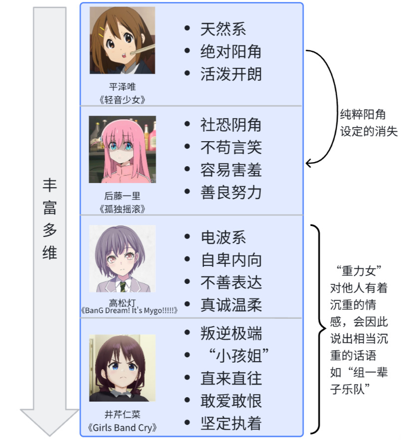 除了叙事方式的变化,近年来的少女乐队番在角色设定上也大有不同。
