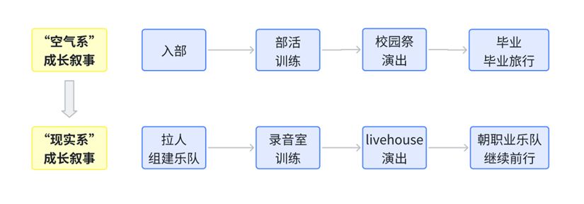 不难看出,近年来的少女乐队番在剧情内核上越来越脱离传统校园番的套路,力图摆脱稚嫩、无害的学生气息,实现了从“部活”乐队到职业乐队的转型,在讲故事的模式上发生了很大的改变。