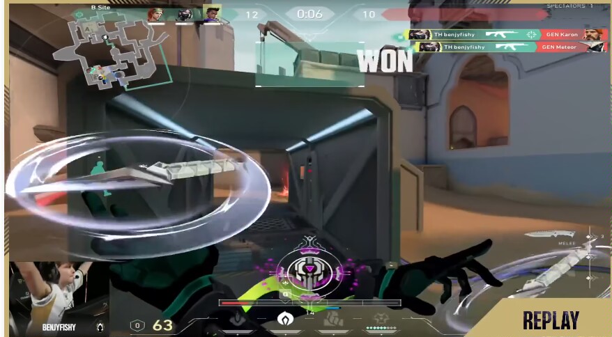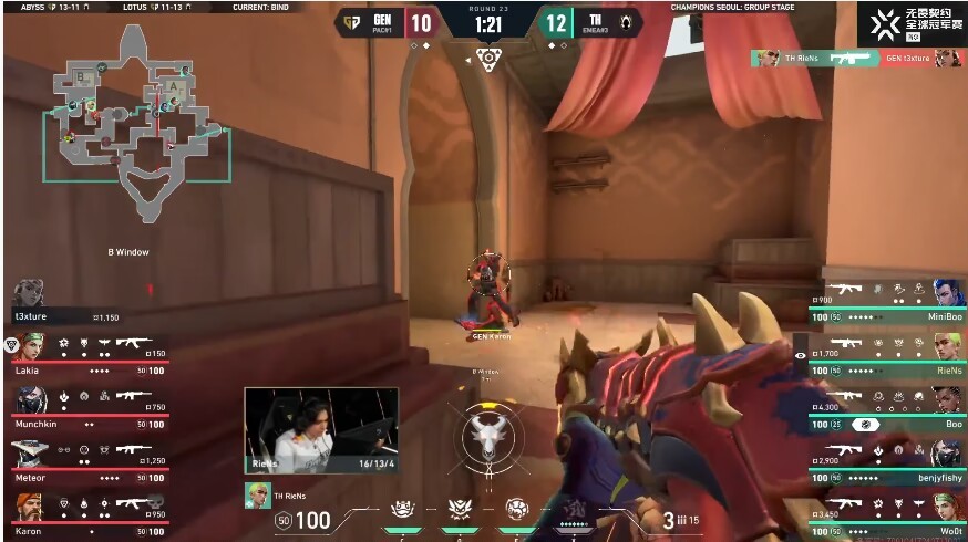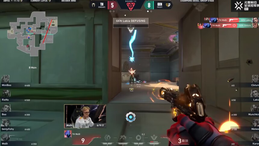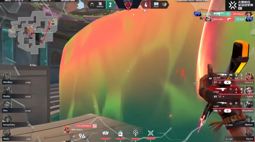 第九回合,Riens先開,混煙秒掉開大viper+斯凱,t3xture反混對手viper,雙方來到二打二殘局,GENG煉獄開大精準套住TH雙人位置,在大招落下前Miniboo+woot雙拉各秒一個,直接打出GENG暫停,兩邊都不乾淨!