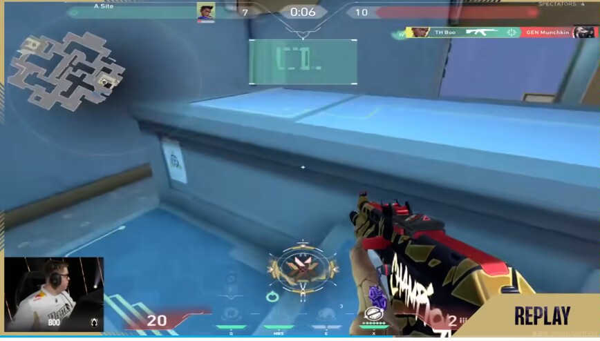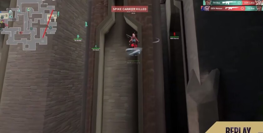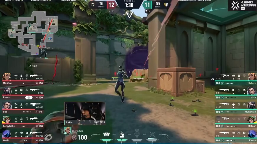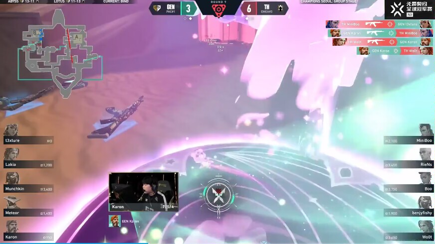 上半場TH雖然拿下手槍局領先兩分,但GENG多半的戰術經常抓到TH的防禦漏洞,第六回合,GENG在b點展開viper+奇樂+黑夢大招,TH反以雷茲+黑夢+viper大招,可惜一個炸彈沒炸到人,一個蝰腹剛展開就寄了,緊接着下回合b點karon,煙中縱橫!
