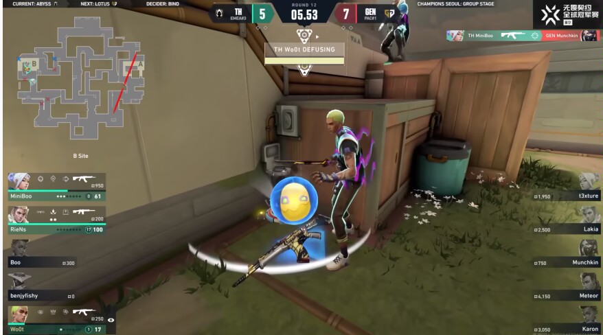 下半場手槍局woot發揮,在t3xture殘局掏炸彈,黑夢拆包的timing時拉出去一打二,挽回團隊,但下一回合Munchkin左輪一槍打掉TH高低雙架的兩人,緊接着下回合捆+炸彈的配合讓GENG又拉大比分到了10-5