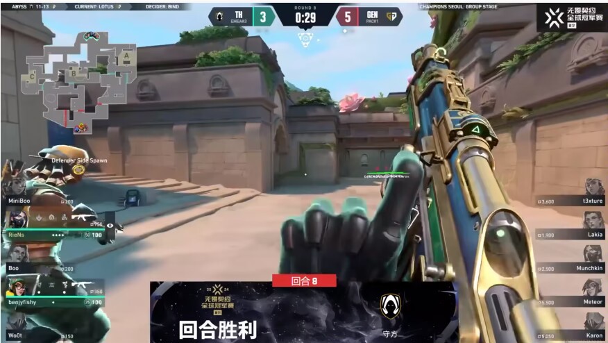 第八回合,t3xture唐三附體,benjyfishy在b點接住Meteor,GENG三人騎虎難下,b點下包被繞後+奇樂大招鎖定,TH追回兩分,但GENG進攻章法十足,直接拿下剩下三分。