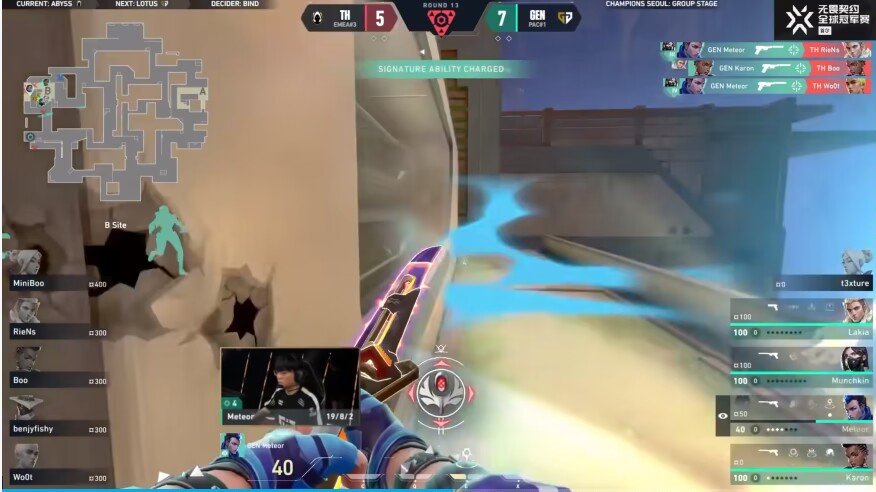 下半場GENG贏下手槍局,追回兩分,karon和Meteor還在盡力,重創TH經濟後t3xture包點雙殺找回手感將比分追回到7-9