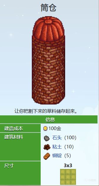 如果玩家的農場中建有筒倉,當玩家用鐮刀在農場上割草時,每次都有一定幾率掉落乾草,並且乾草會自動添加到筒倉中,直到筒倉已滿。