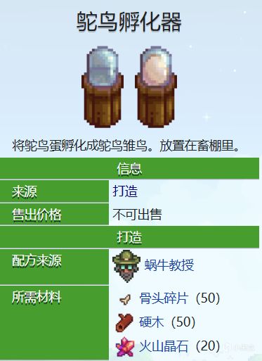 獲取鴕鳥蛋可通過解開姜島的日記殘頁 #10的祕密後獲得的動物製品,或者火山地牢寶箱有概率獲得。