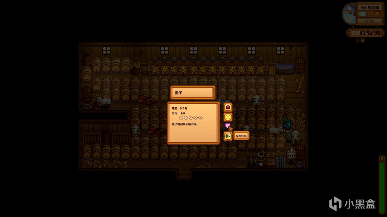 ①撫摸(加32-36點 ,如果玩家選擇的是牧羊人或雞舍大師職業,對應的動物的心情值會加倍)