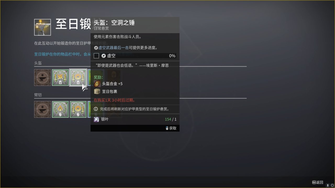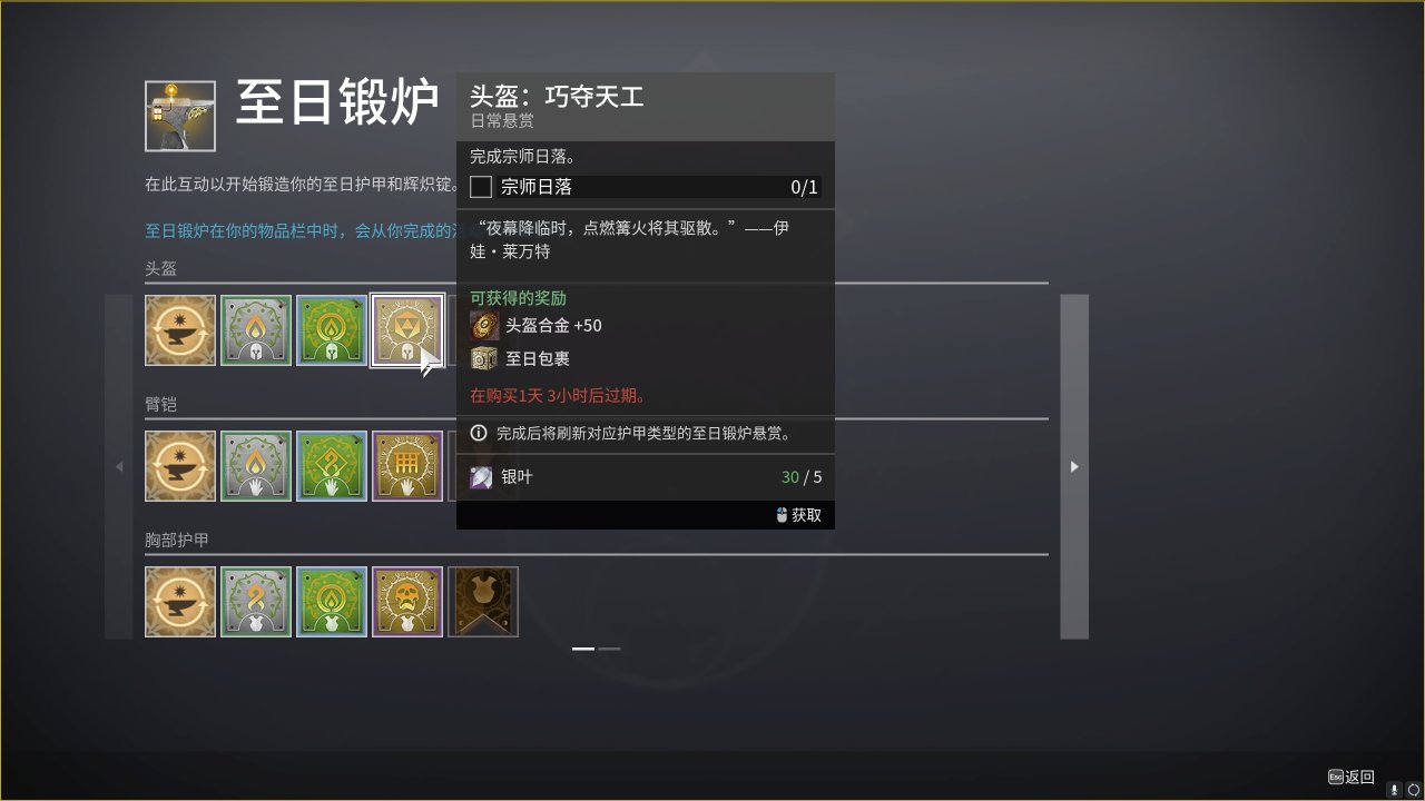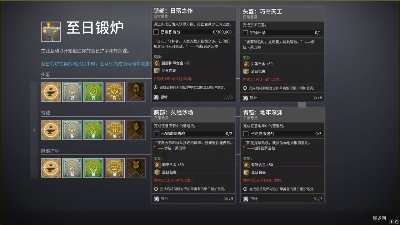 我們需要使用銀葉在至日煅爐中,刷新出金色品質的懸賞任務,這種任務可以提供50個合金,1個至日包裹