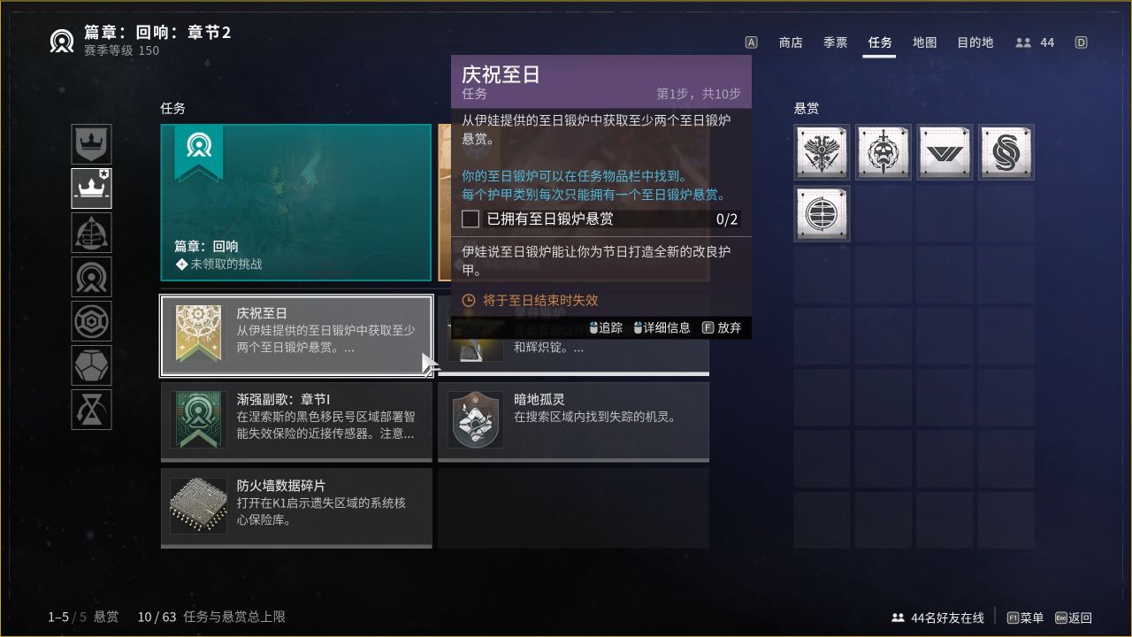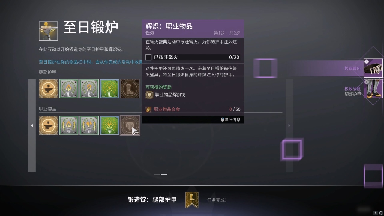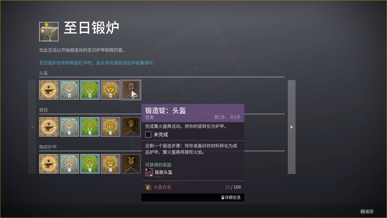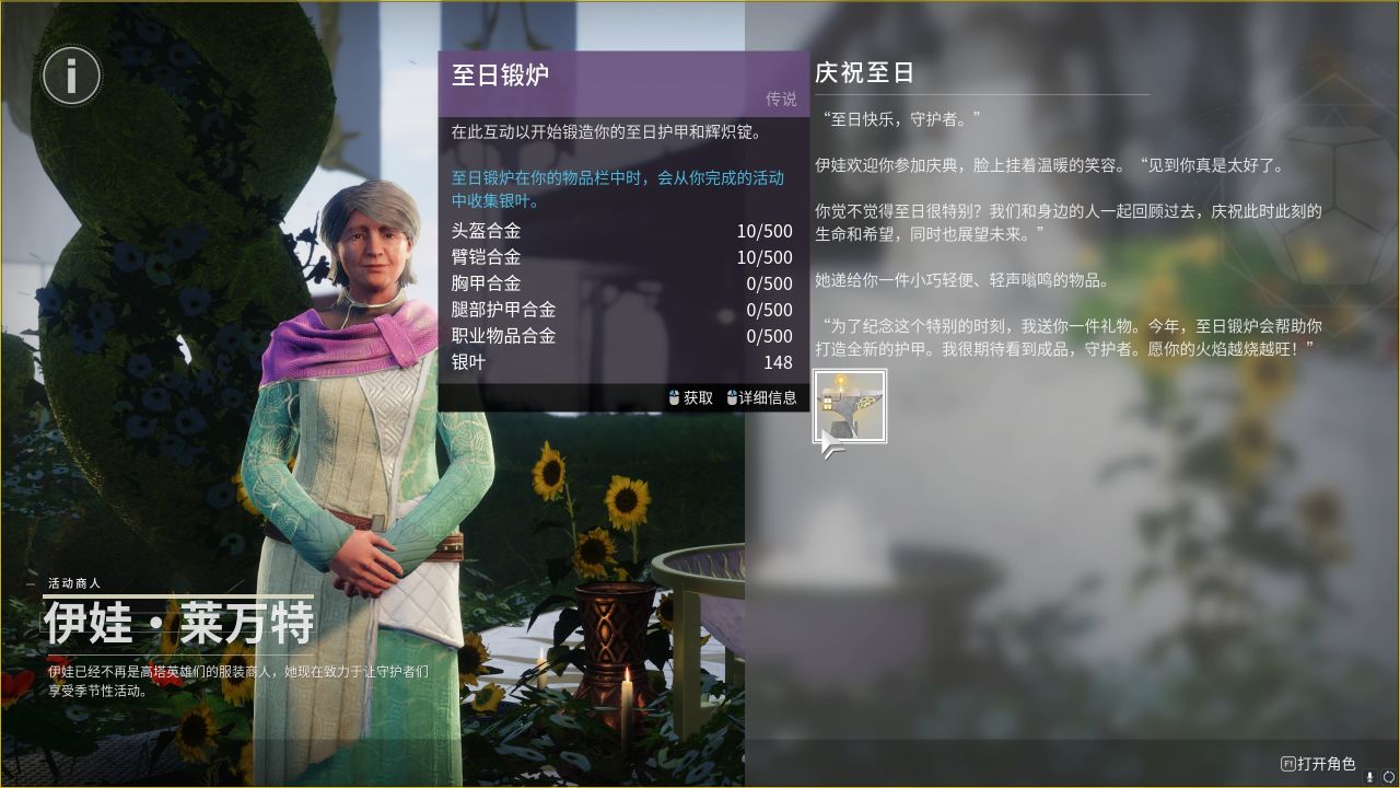 按照“慶祝至日”任務的要求,領取至日煅爐中的懸賞並完成後可以獲得“特定部位護甲的合金”和“至日包裹”。然後回到高塔和伊娃對話,會進一步解鎖煅爐的任務重置功能。