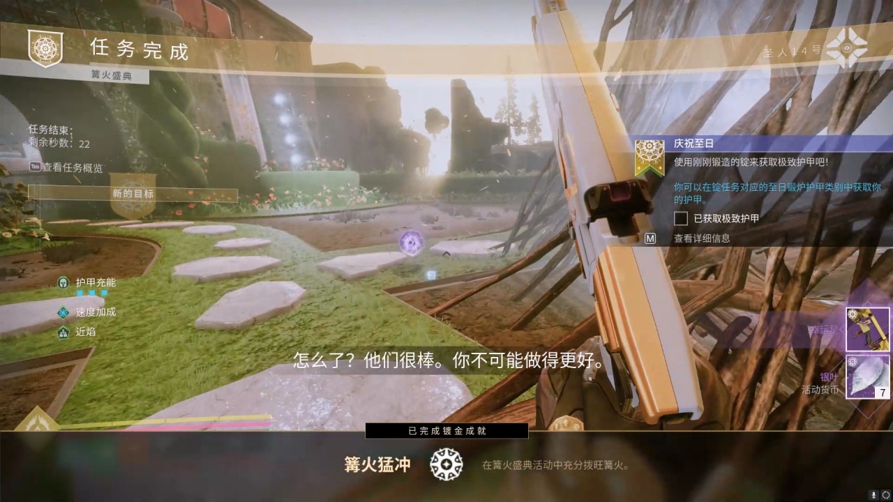 到這裏,至日任務“慶祝至日”引導你所做的事情,就是白光護甲的獲取全流程。