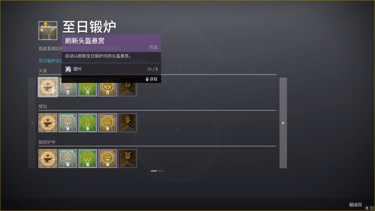此時“慶祝至日”任務也會要求你重置一次煅爐中的懸賞,打開煅爐界面,點擊最左邊的“刷新懸賞”花費5個銀葉即可刷新右邊該護甲的懸賞(注意不要重置金色的懸賞)。