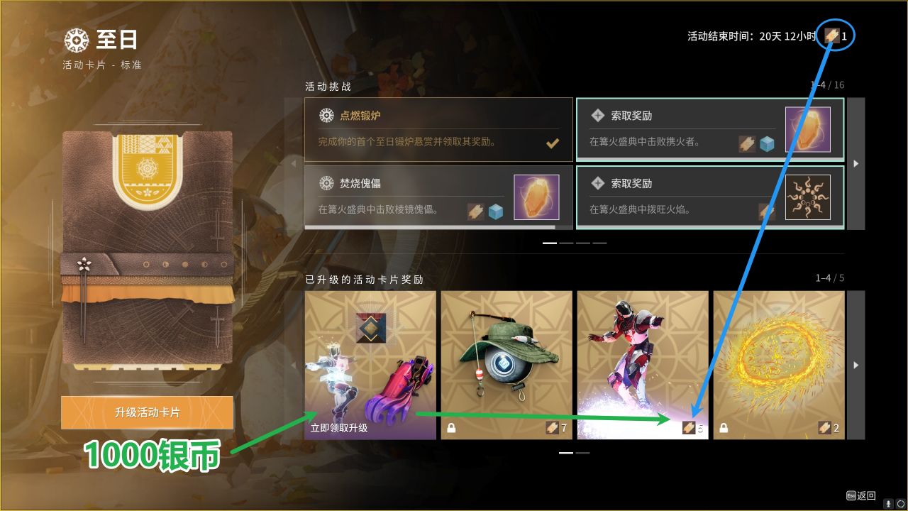 活動卡片付費獎勵:花費1000銀幣升級活動卡片,立即獲得部分道具,用免費挑戰獎勵的“入場券”解鎖剩餘的付費道具
