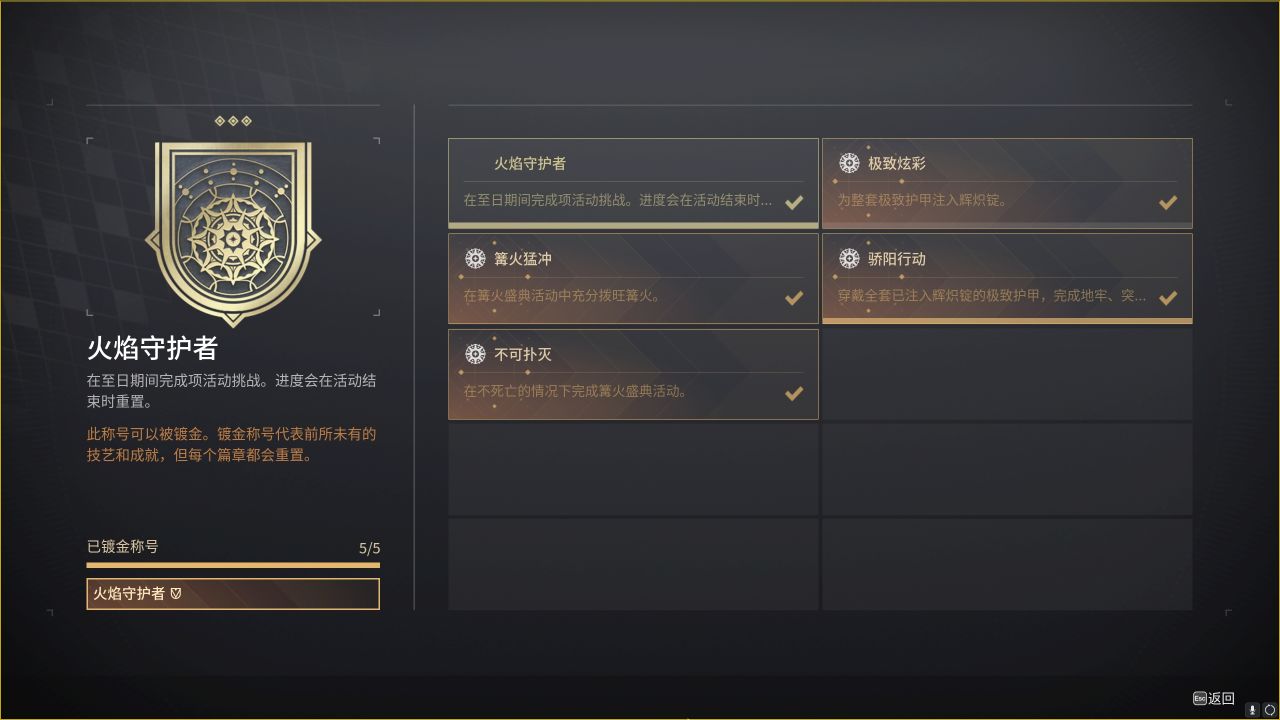 二至點稱號“火焰守護者”:紫色稱號需要完成全部卡片挑戰獲得。鍍金成就有4個,完成後可以鍍金火焰守護者稱號。