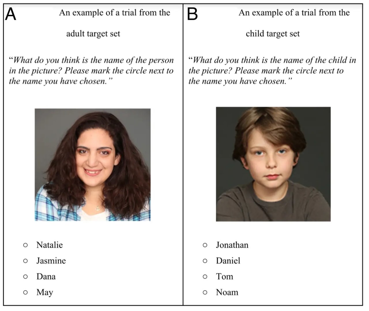 放錯圖片了哈哈哈,是底下這種類型的。 受試者有兒童,有成年人,分別對兒童、成年人進行外貌與名字的選擇實驗。