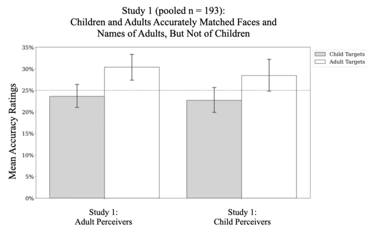然而,對於兒童的面部和名字,參與者均無法進行準確的匹配。(黑色柱子)
