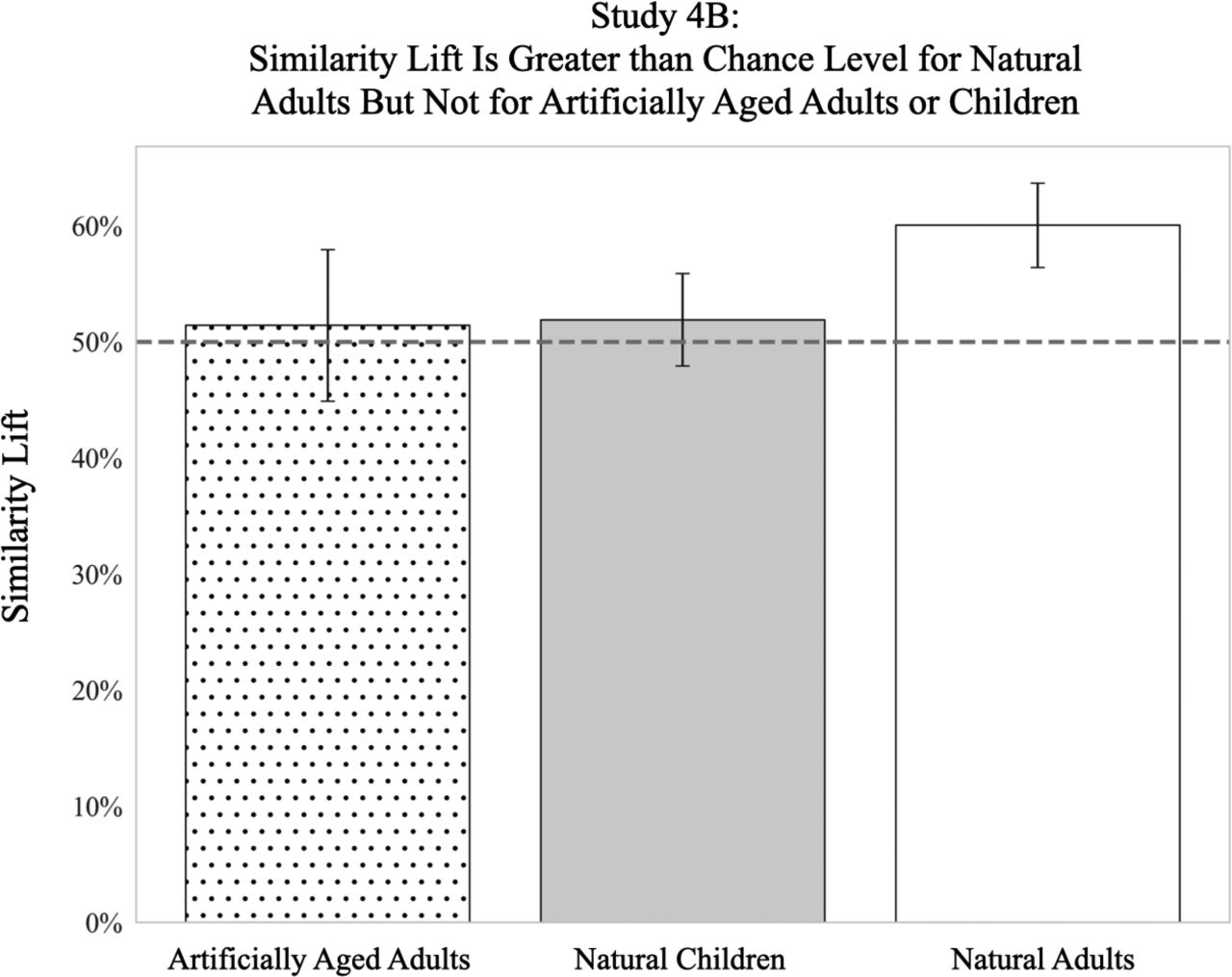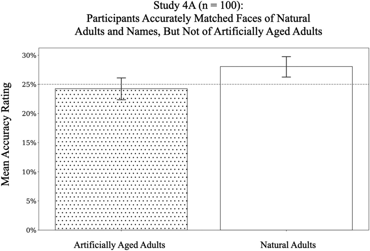 下圖:成年參與者將真實姓名與其面部相匹配的平均準確率,包括自然成人圖像和數字衰老圖像。