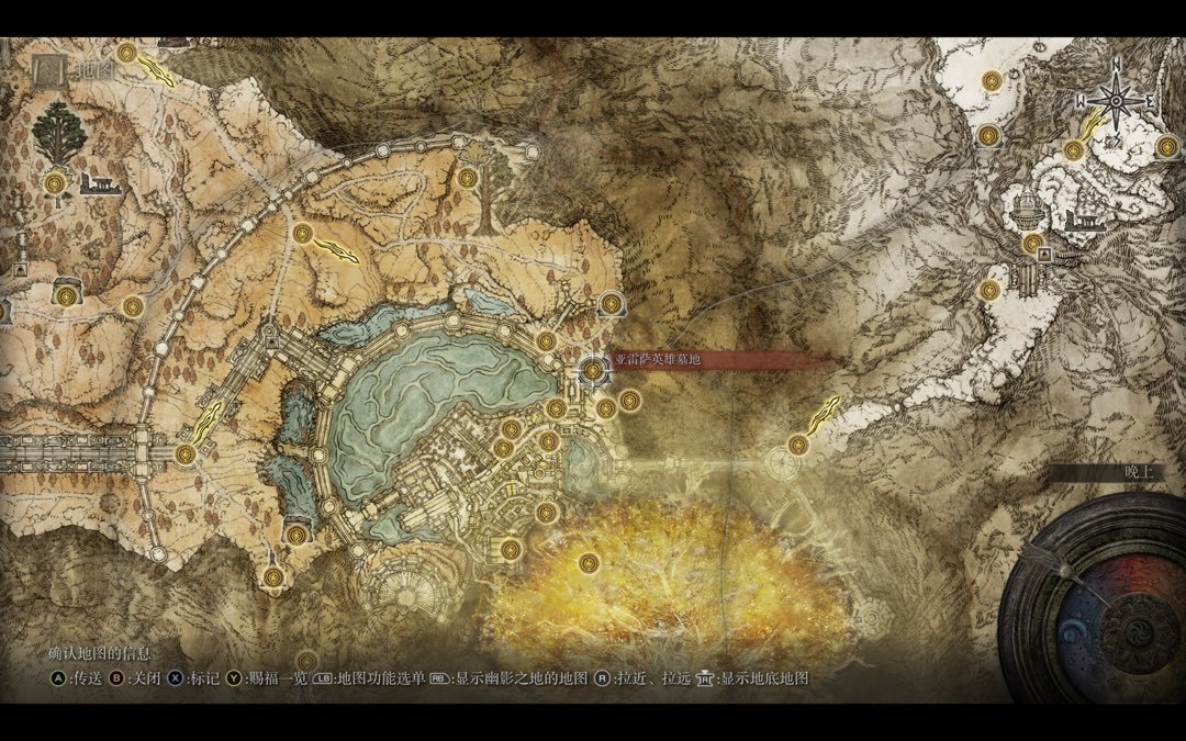 從王城城牆前方賜福點出發,沿標記點前進,到達亞雷薩英雄墓地,墓地賜福點對面小房間亮光點處獲取