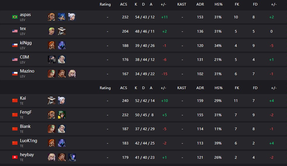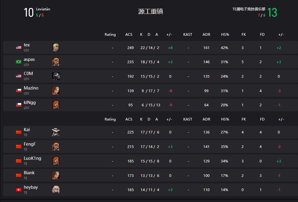 關鍵局,LEV交出所有大招,而且賭對防守薄弱的B點,但TE全員發力,最後頂着混煙的LEV拆包拿到賽點,最終局LEV 沒有經濟,aspas雖然雷茲大招進點有所發揮,但槍械劣勢加TE手感火熱,最終TE成功拿下自選圖,TE敢選聯賽打的很差的地圖打LEV,可見他們真的是努力研究了,加油!
