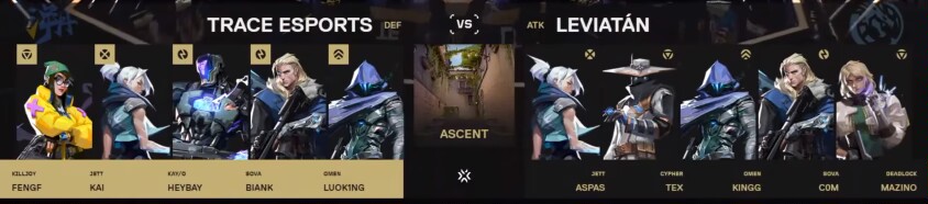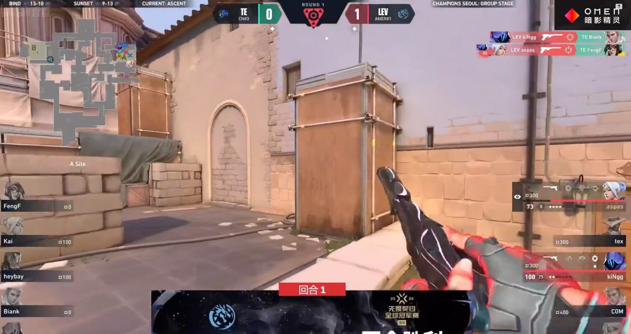 第八回合LEV的包點搶線卡住TE,KAI在B點關鍵單摸成功單殺com,TE得以轉點B點下包救回一分,雙方4-4戰平,第九回合TE fake B點提速打A,heybay關鍵殘局一打二,拿下aspas開大雷茲,這一波TE的戰術調整成功實施,打破了LEV的大招循環,比分來到 TE 5-4 LEV,LEV叫出暫停應對。