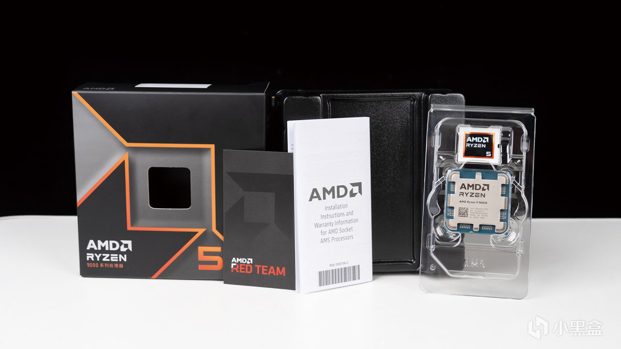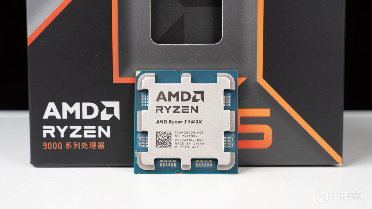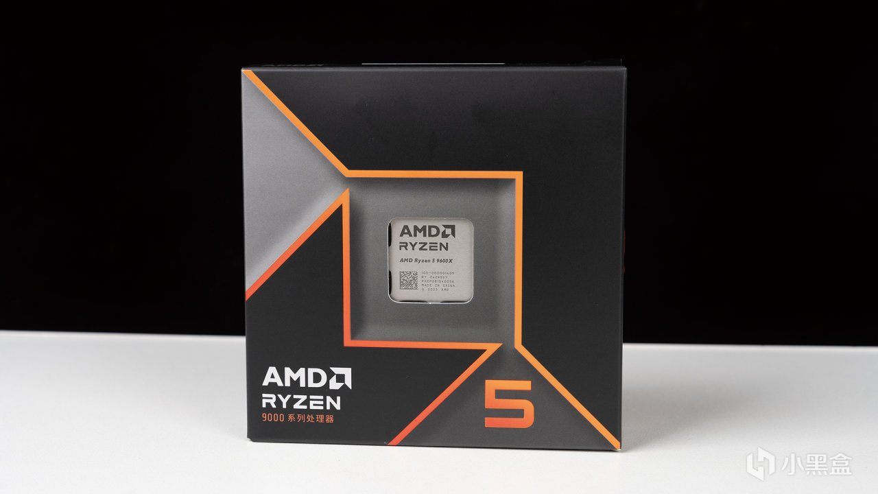 硬核首發測試的型號是銳龍5 9600X,包裝盒風格延續了銳龍7000的設計,中間依然是透明窗體,主題顏色有所變化,從水泥灰變成了純黑,加上橙色裝飾線條加粗,所表達的意思可能是這樣——變強、黑馬之類的。