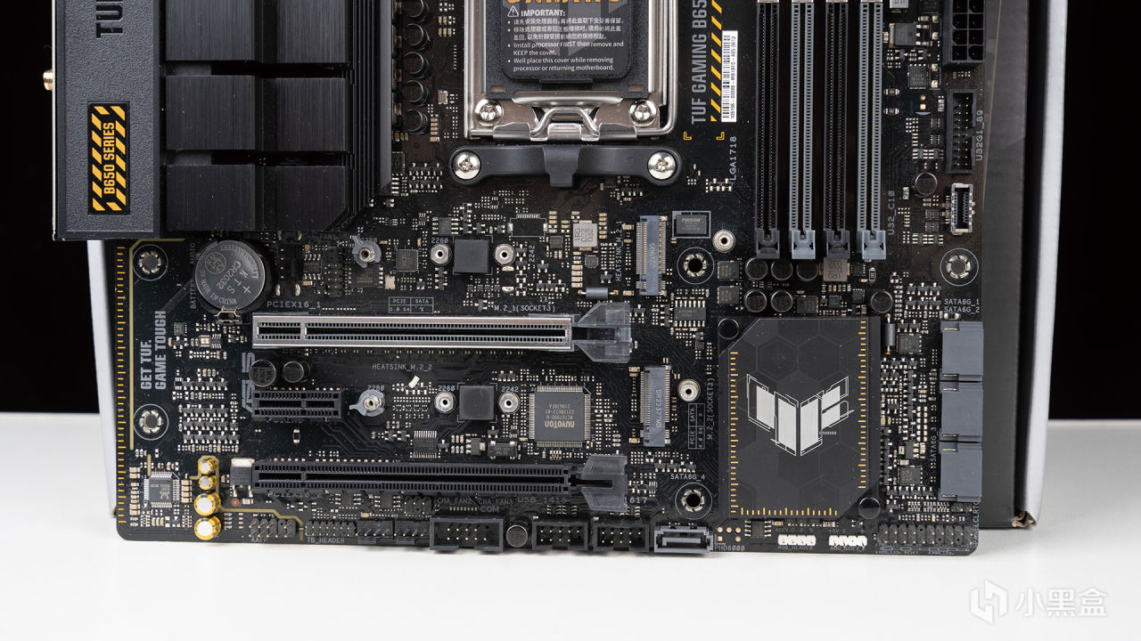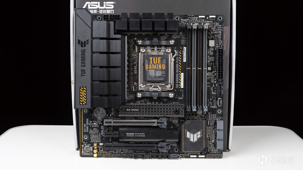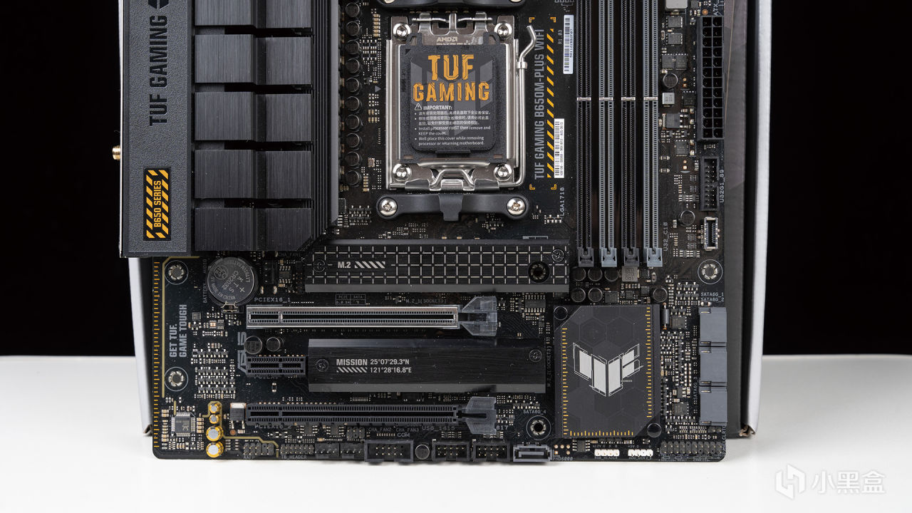 本次測試銳龍5 9600X的主板座駕——華碩TUF GAMING B650M-PLUS WIFI重炮手,屬於目前最爲流行的MATX規格,風格設計偏硬派,散熱馬甲上有TUF GAMING的黑黃元素裝飾,最特別還是兩片鏤空設計的VRM散熱片,不但造型符合整體硬派格調,還能增強散熱效果。