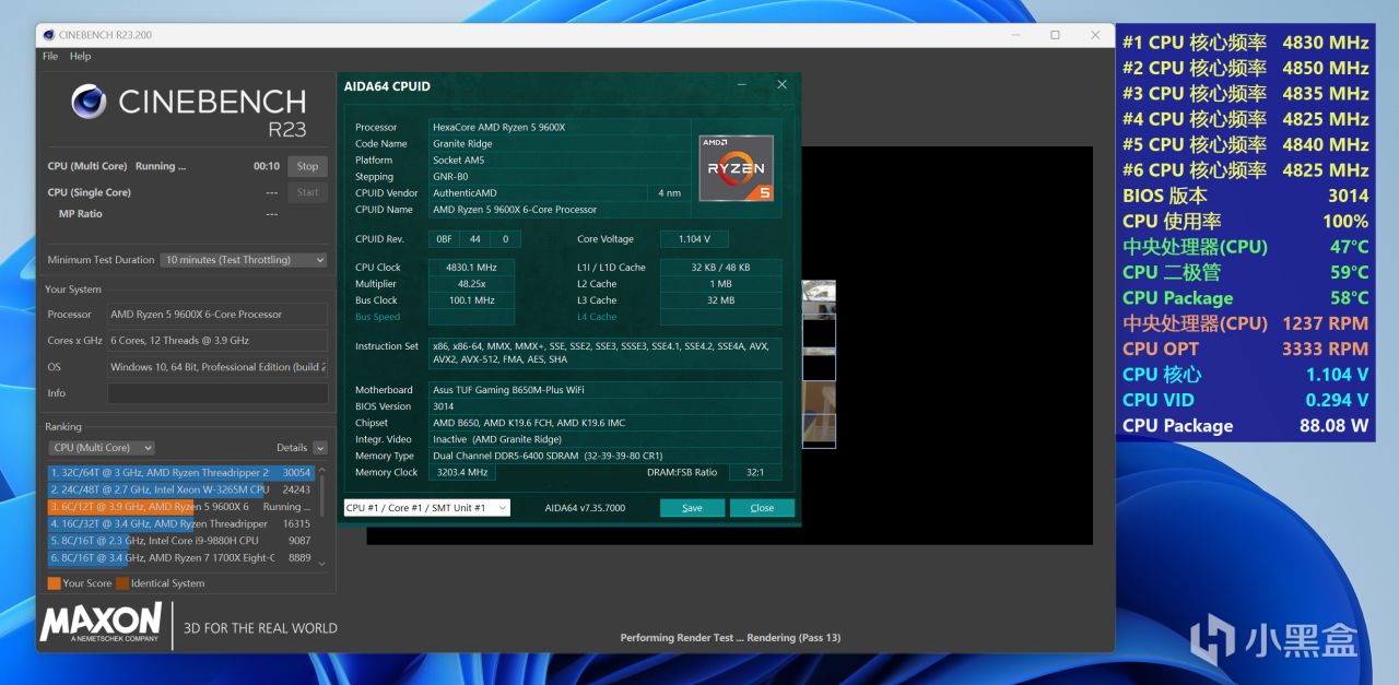 銳龍5 9600X默認PBO AUTO(Disable)運行十分鐘CINBENCH R23多核項目,全核心穩定4850MHz左右,核心電壓1.10V,CPU Package功耗88W,CPU二極管溫度59℃