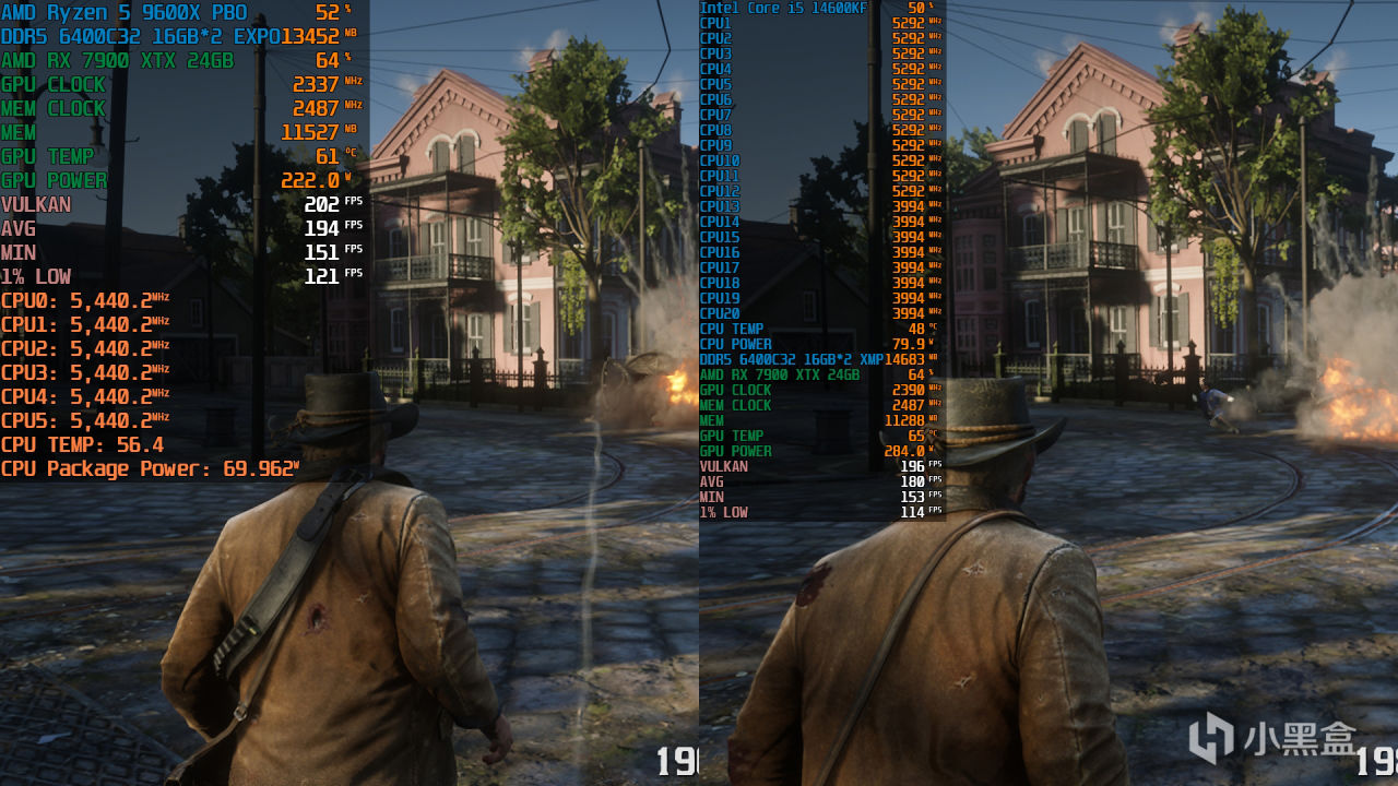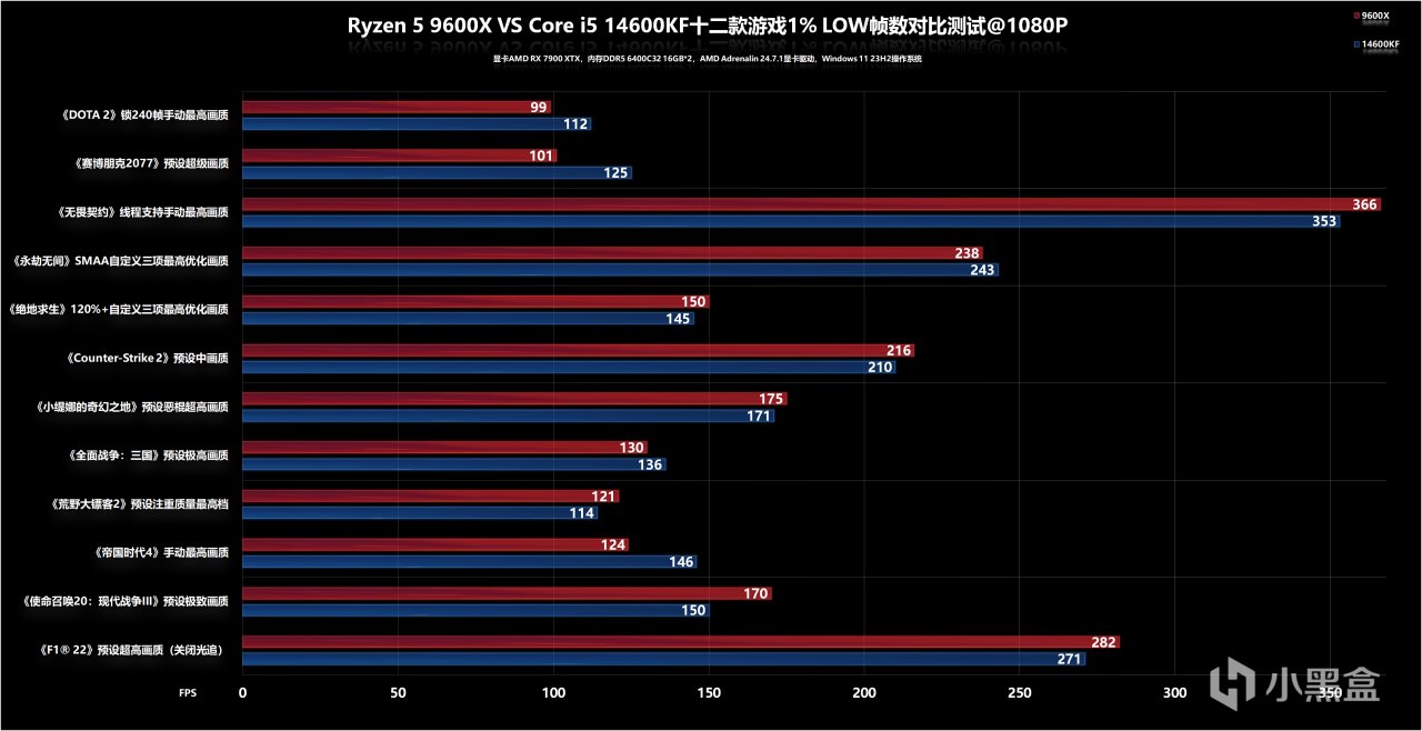最令人意想不到的是,經典開放世界代表之作《荒野大鏢客2》這種大型單機也可以碾壓10%幅度,反觀落後的兩個遊戲,酷睿i5-14600KF最多隻有10%和6.9%幀數優勢。至於1% LOW幀來看的話,銳龍5 9600X也能勝出七款,整體遊戲流暢度體驗會更好。