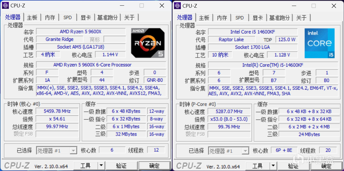 CPU-Z規格對比,從核心頻率來看,銳龍5 9600X和酷睿i5 14600KF是極其相近的,藍廠本質架構還是上一代的Raptor Lake,主要是依賴堆疊能效核以及提升頻率,工藝製程還是10nm,能耗比是很難控制好的,相反AMD每代都在更換製程工藝,能耗比提升就是必然的。CPU-Z娛樂跑分就略過了,來看看下面的硬貨項目吧。