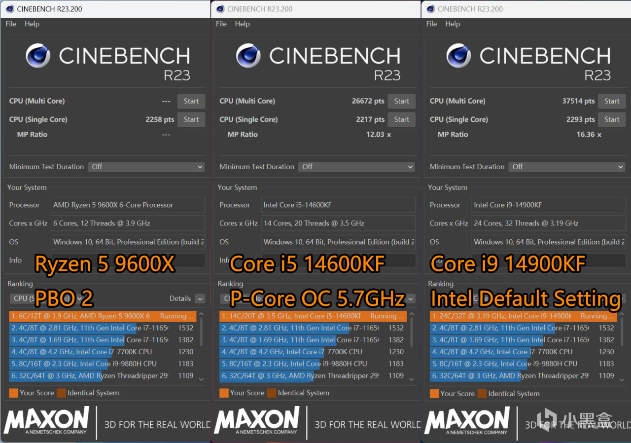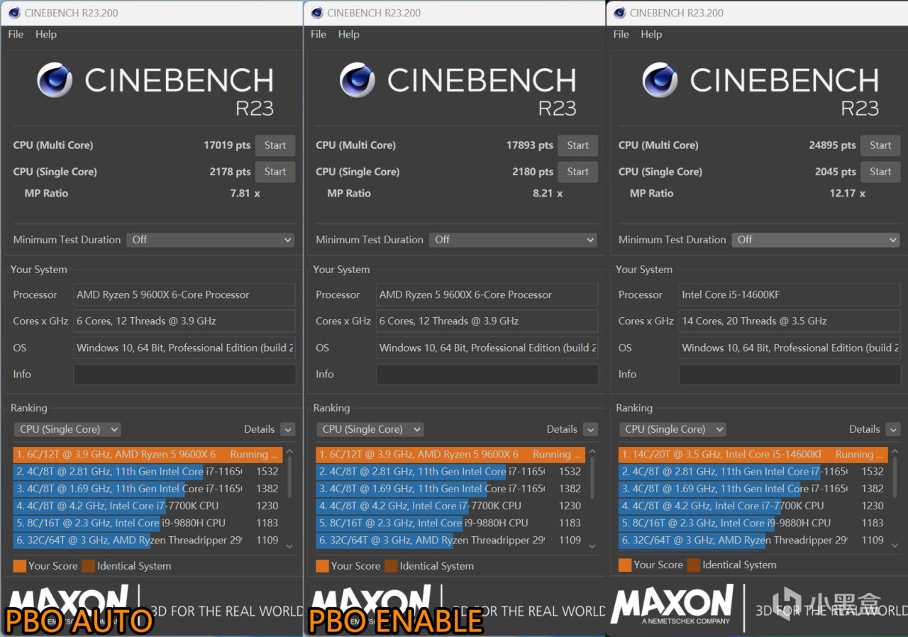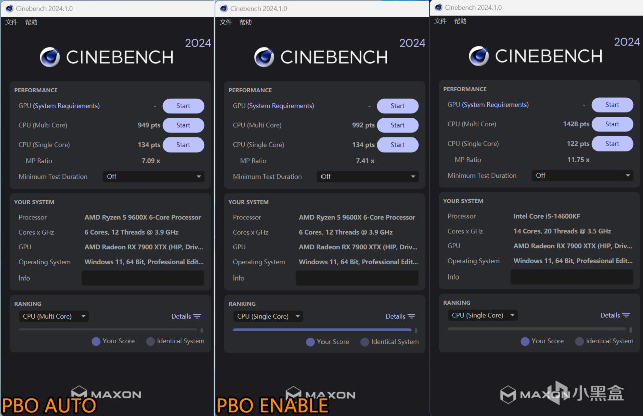 2024年版本的CINBENCH,相比R23會更依賴內存一些,得分來看銳龍5 9600X單核性能領先幅度進一步擴大達到了10%,開啓PBO後相比默認多核提升4.5%,多核方面和14600KF差距相比R23更大, 看來兩款CPU都是獨佔一方甜頭。