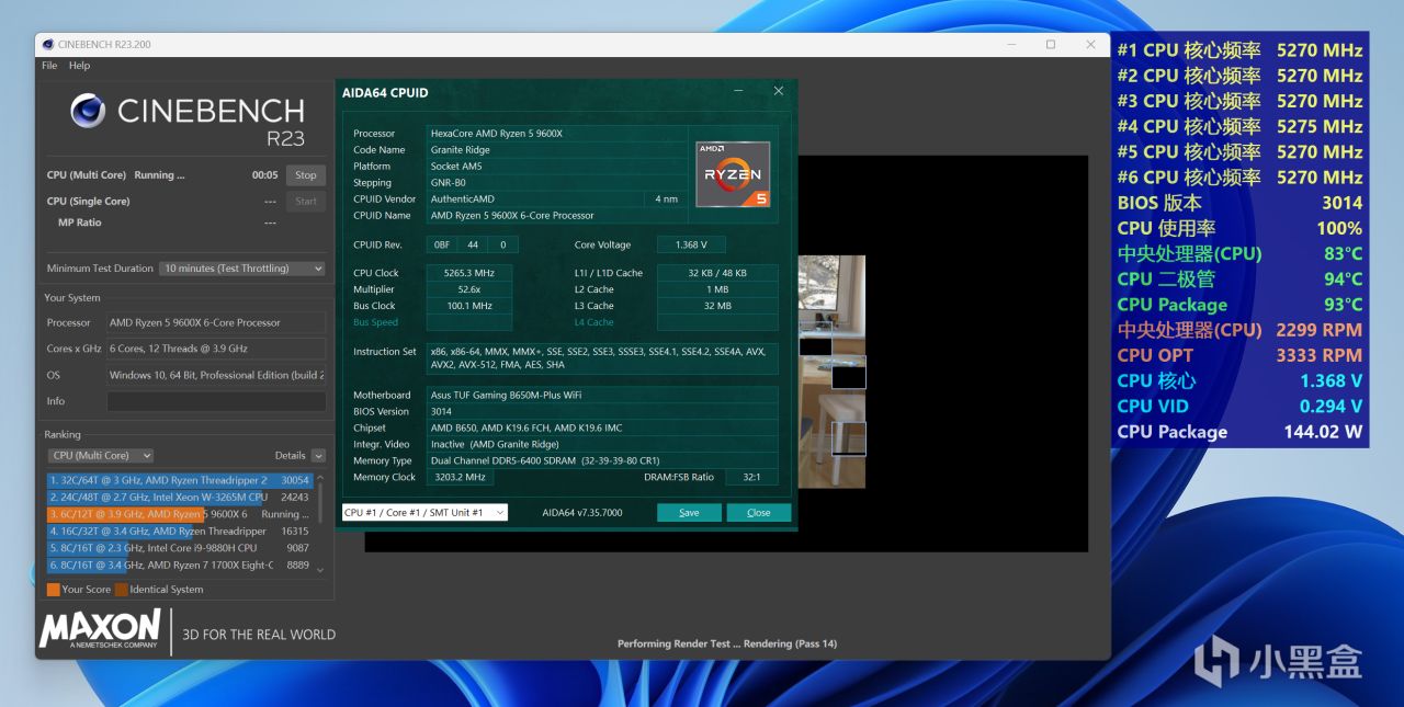 銳龍5 9600X設置PBO Enable運行十分鐘CINBENCH R23多核項目,全核心穩定5270MHz左右,核心電壓1.368V,CPU Package功耗144W,CPU二極管溫度94℃