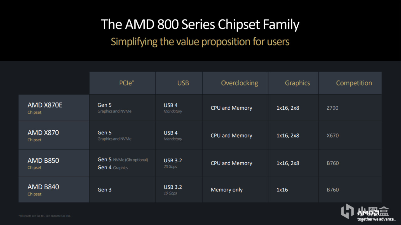 新主板方面,距離上市還有一段時間,目前已知X870E和X870是原生支持USB 4,而B850就是B650的迭代產品,只不過M.2和顯卡均支持PCIe 5.0,顯卡也可以選擇PCIe 4.0。B840是最有意思的,AMD也終於推出了一個不支持CPU超頻但支持內存超頻的芯片組,個人感覺內存超頻收益大,B840纔會有吸引力,USB和通道支持有所縮減,怎麼看主板價格都應該實惠。