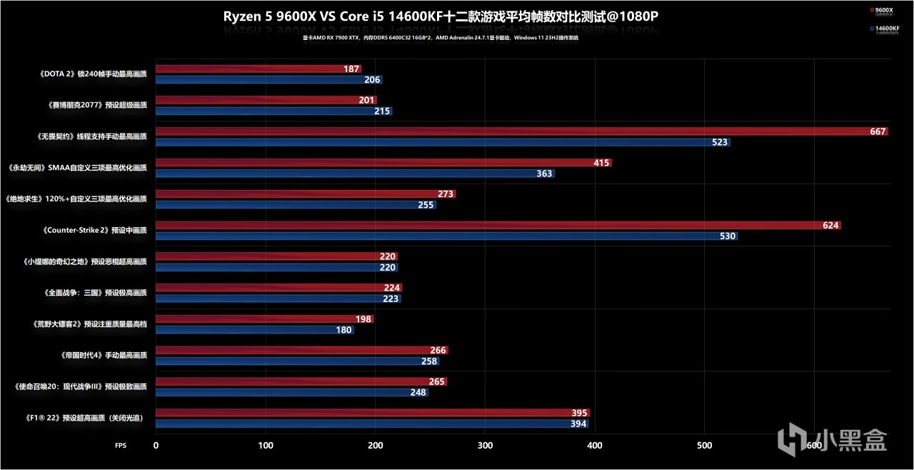 銳龍5 9600X(PBO Enable) VS 酷睿i5-14600KF(解除功耗限制)遊戲平均幀率圖表