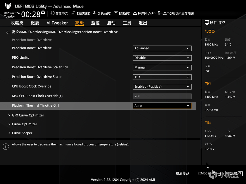 在說功耗和溫度之前,先進入BIOS調試一下PBO 2設置,按照慣例設置10X和200MHz數值,負壓數值手上這顆U可以降到30,如果想全核負載頻率任何情況下更高,可以設置一下PBO Limits選項,當然得注意散熱器性能要足夠強大,遊戲玩家按照以上設置就沒毛病了。