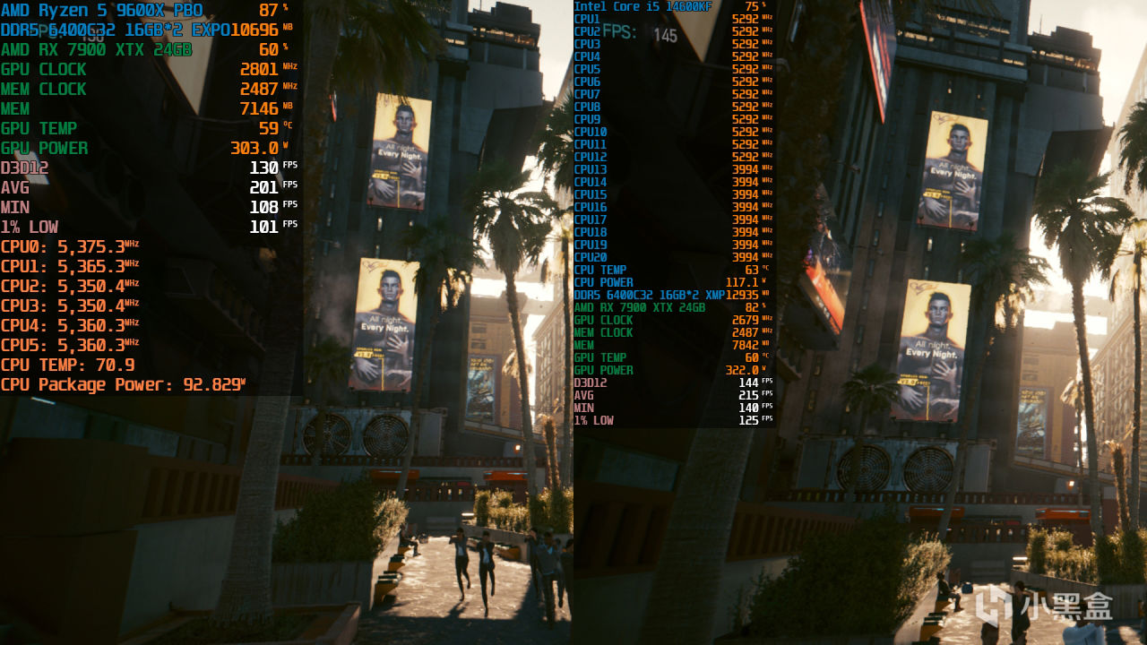 銳龍5 9600X(PBO Enable)運行《賽博朋克2077》1080P,功耗爲92W,溫度70℃