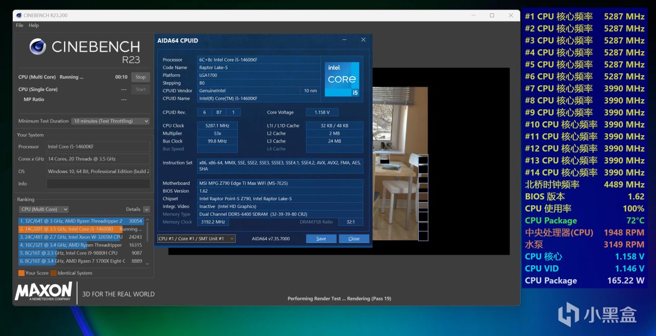 酷睿i5-14600K解鎖功耗運行十分鐘CINBENCH R23多核項目,全核心穩定5287MHz+3990MHz,核心電壓1.158V,CPU Package功耗165W,CPU Pakage溫度72℃