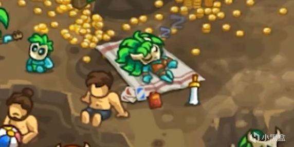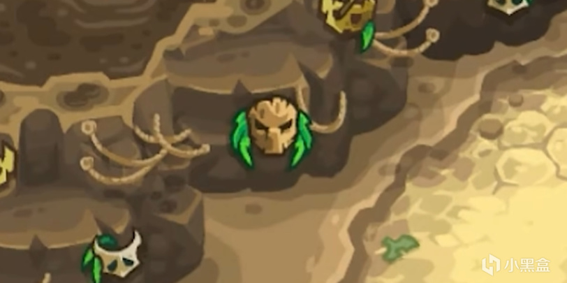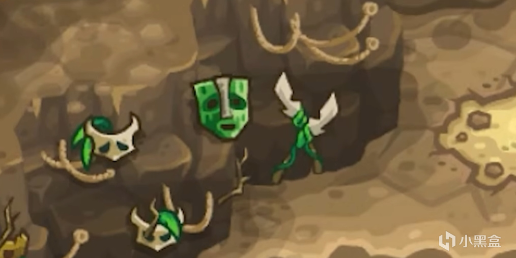 关卡“11.深谷高原”,右下方2个小人赶走蜘蛛怪。出自小说《魔戒第三部:王者归来》与电影《指环王3:王者归来》中,霍比特人山姆手持星光水晶瓶与精灵宝剑赶走了蜘蛛怪物希洛布,救回了佛罗多。