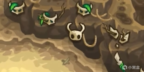 关卡“6.野兽巢穴”,左上角双角黑眼面具。出自游戏《空洞骑士》中,主人公空洞骑士的形象。