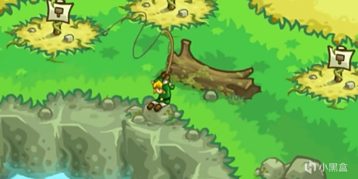 关卡“2.守卫之门”,左下方绿帽小人钓鱼。出自游戏“塞尔达传说”系列中,主人公林克的形象。