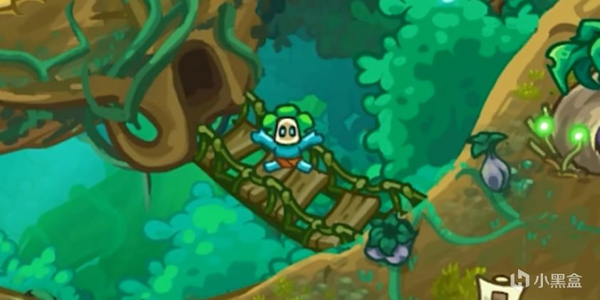 关卡“4.翡翠树梢”,吊桥上来回走动的树灵,点击后会坠落。出自游戏“马力欧”系列中,马力欧碰到怪物后死亡的动作与音效。