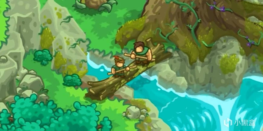 关卡“1.碧绿之海”,上方2个小人在独木桥打斗。出自电影《罗宾汉历险记》与剧集《侠盗罗宾汉》中,罗宾汉在独木桥与小约翰不打不相识的桥段。