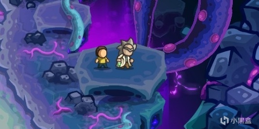 关卡“14.腐化山谷”,右上方2个小人不断穿越绿色时空门。出自动画“瑞克与莫蒂”系列中,瑞克与莫蒂常常使用时空枪穿梭各个世界与时空。
