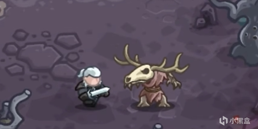 关卡“7.冷峻峡谷”,右下方白发小人杀死鹿头怪物。出自游戏“巫师”系列中,猎魔人杰洛特讨伐鹿首精。