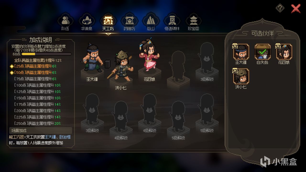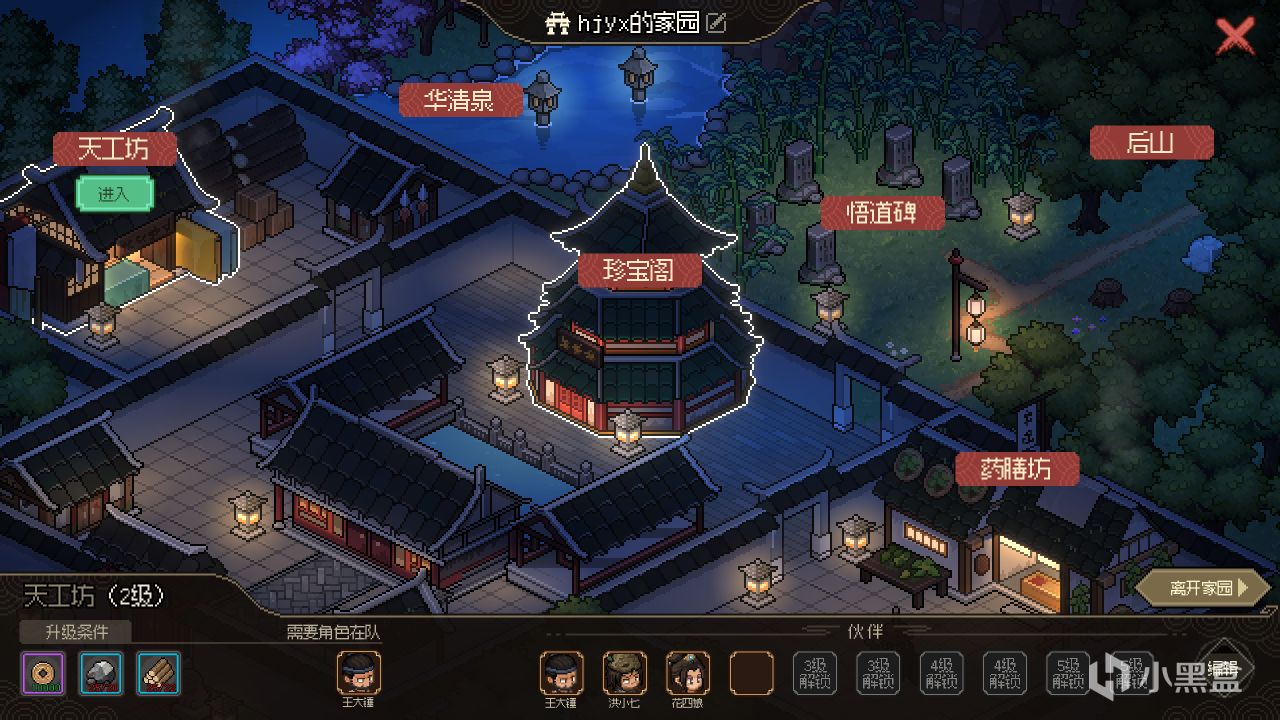 私人庭院可以認爲是一個爲終局遊戲和多周目量身訂做的系統,在其中你可以建造和升級天工坊、華清泉、珍寶閣、悟道碑、藥膳坊等設施,其中可以製造衣服和打造兵器的天工坊需要無名村的王大錘在隊內方可開啓,負責製藥和做飯的藥膳坊則是需要無名村的白頭翁,這某種程度上也算是一種遊戲歷程上的有始有終——因爲後來我們能結交的隊友往往在戰力方面更加出色,但是最初的隊友也能在遊戲的末期給我們帶來巨大的幫助。
