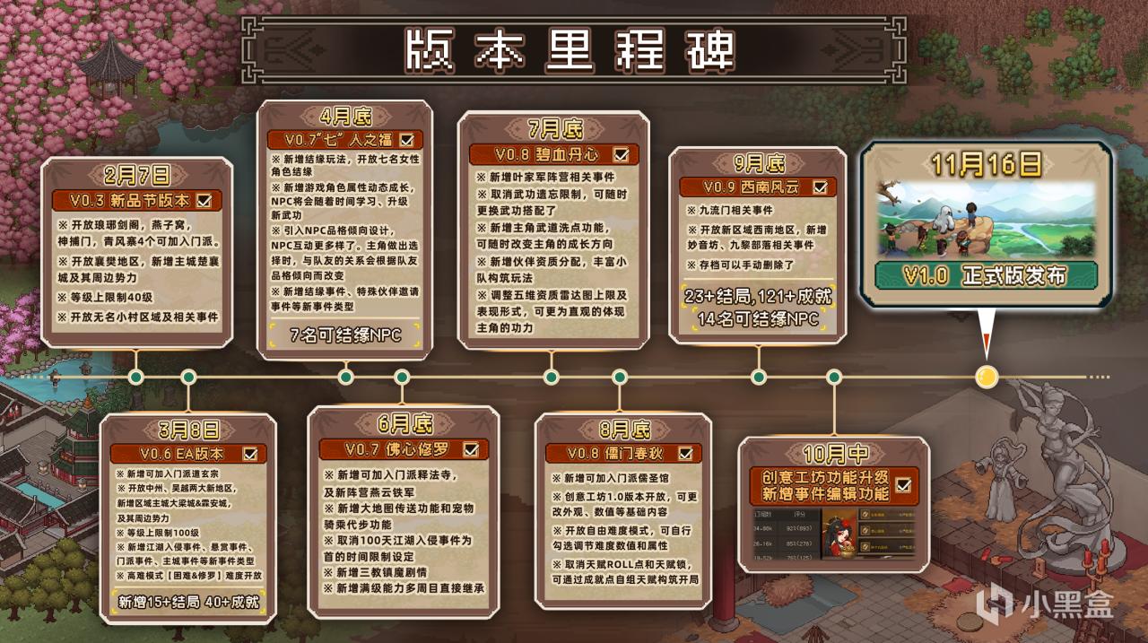 《大俠立志傳》想要打造動態江湖的江湖繪卷需要的是非常驚人的內容堆料,在過去9個月的歷程中,他們也踏踏實實的走完了一步步的更新曆程,在11月16日終於迎來了1.0版本的誕生。