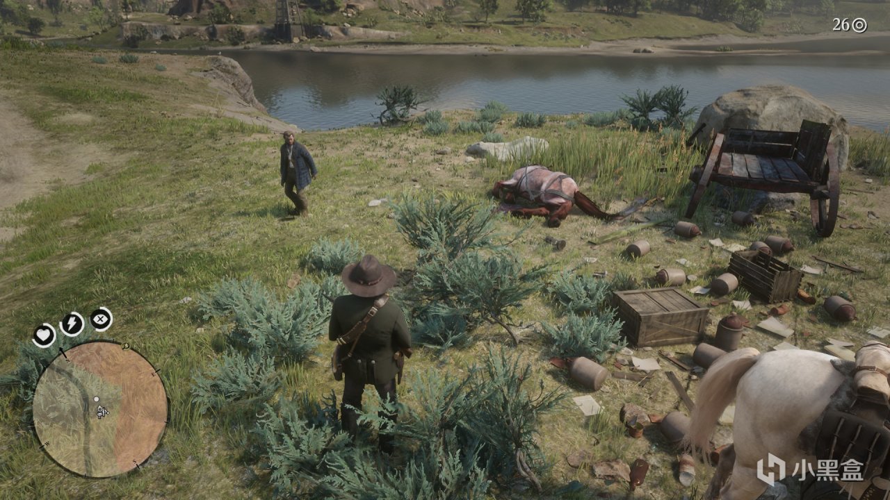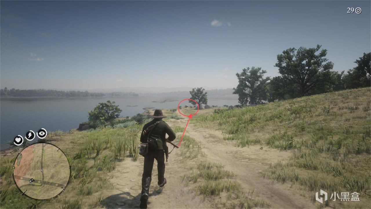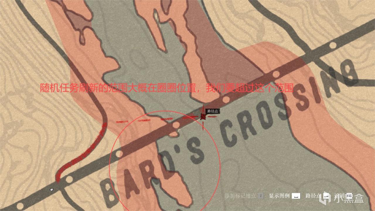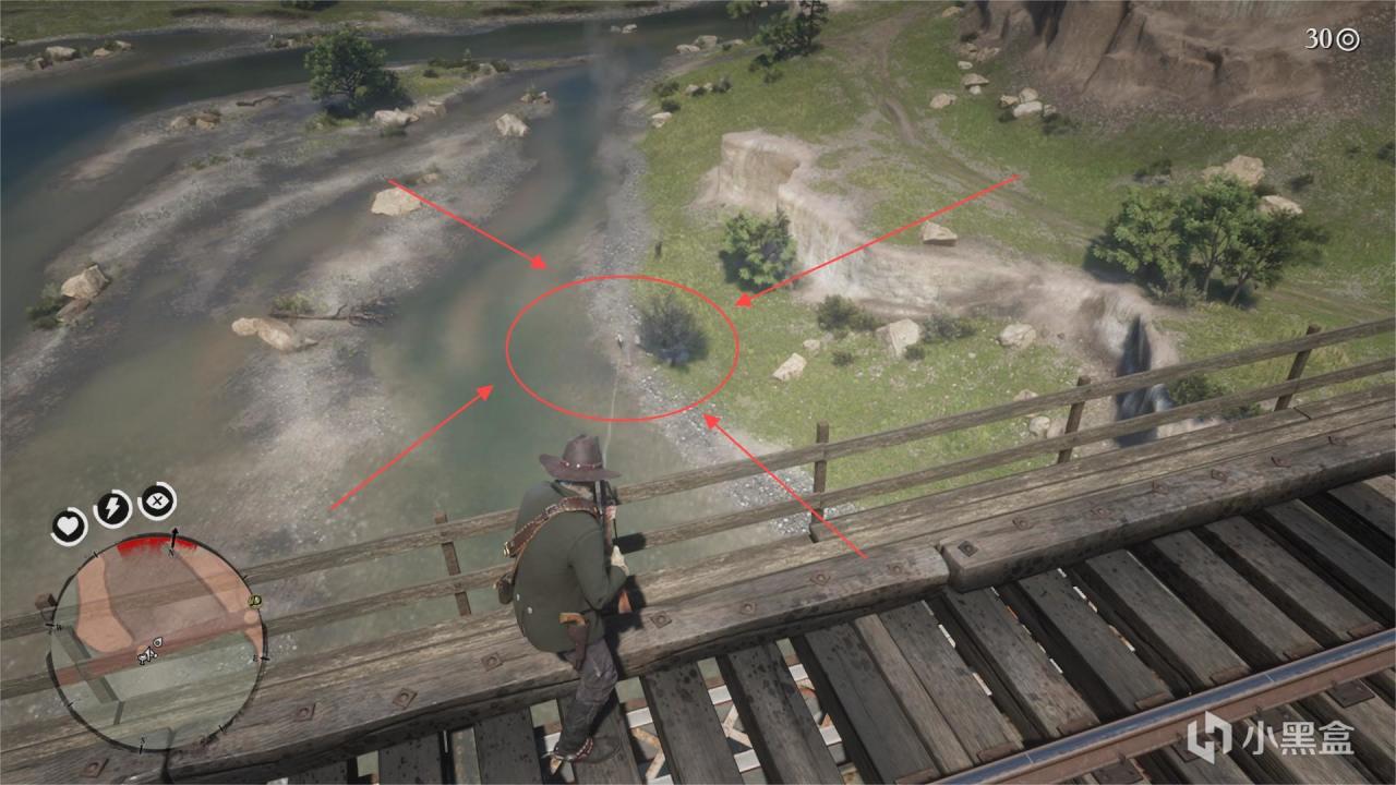 🌹第四步:到达点位以后呢,我们需要有一个必要条件,就是看一下桥下面的下面有一个露营的人在不在,不在的话要读档刷新(可以提前通过看空中冒起来的烟火进行判断)。在的话往他旁边打一枪,不要杀他,拉仇恨,,直到出现地图上的红色半圆提示。