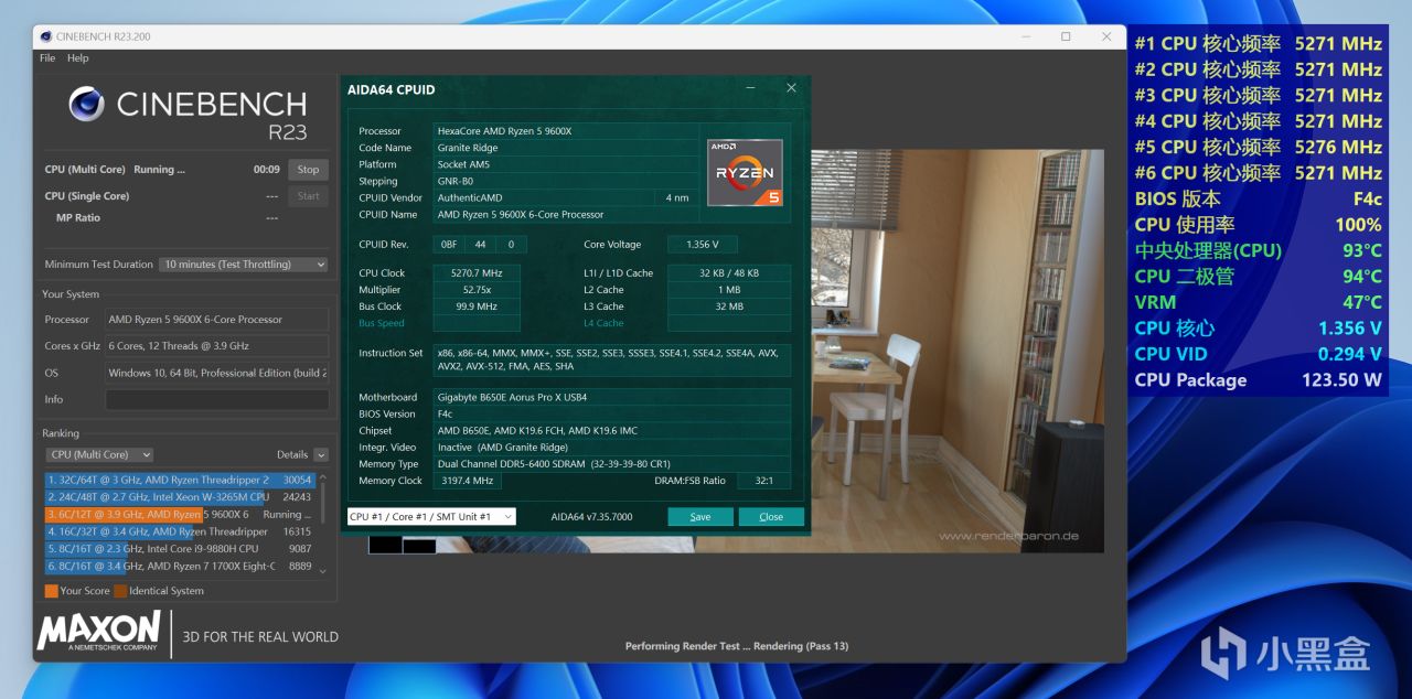 銳龍5 9600X設置PBO Enable運行十分鐘CINBENCH R23多核項目,全核心穩定5271MHz左右,核心電壓1.35V,CPU Package功耗123W,CPU二極管溫度94℃